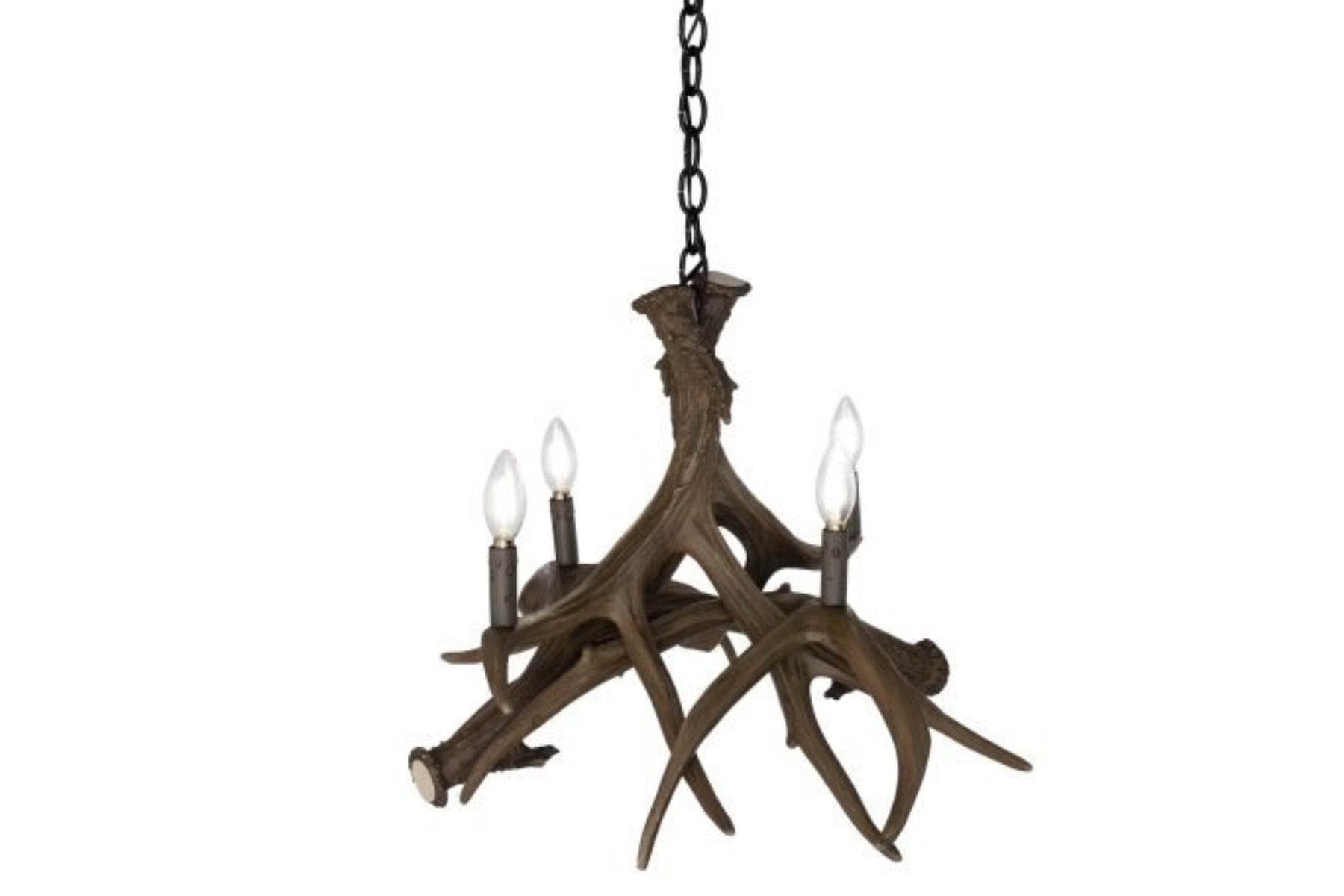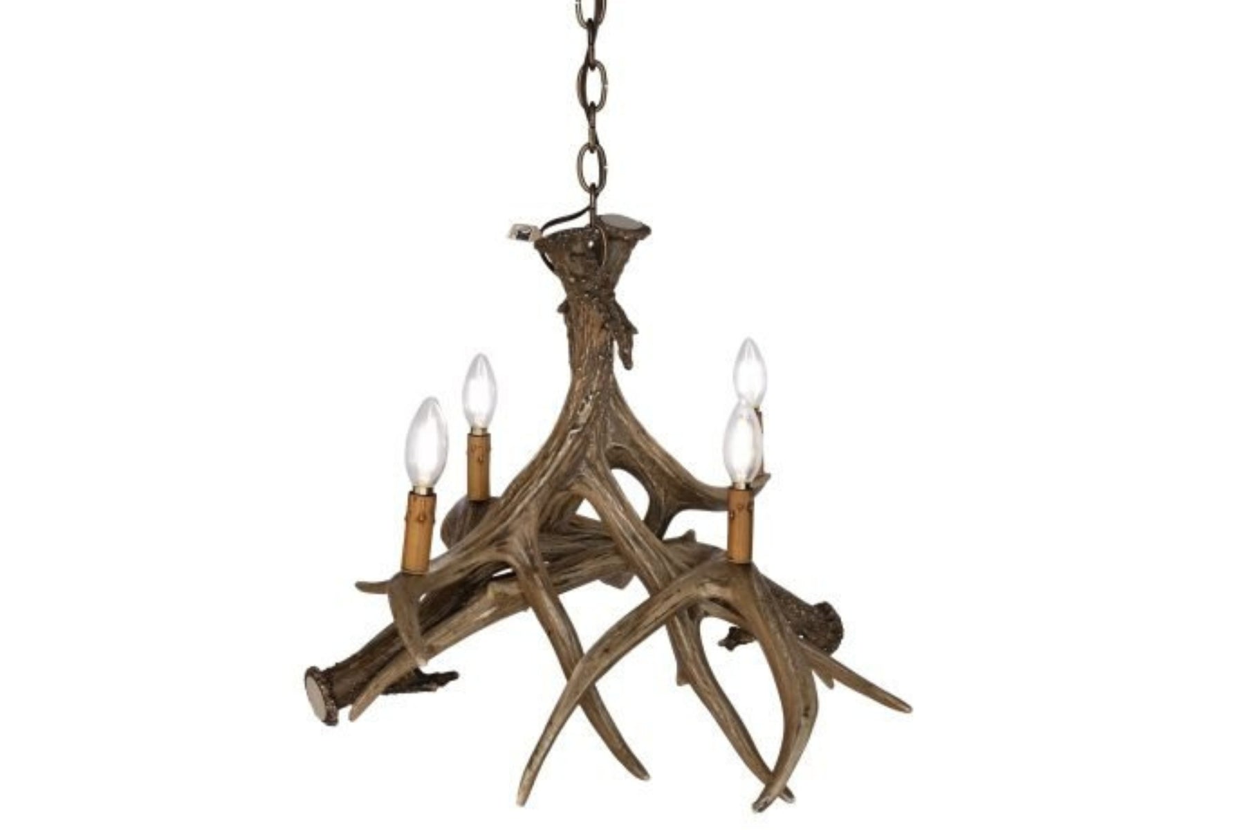 This mule deer 4 antler reproduction chandelier is a perfect lighting option for any small space. The 4 25-watt candelabra lights will provide an ambiance of light while hanging over your table, or other small spaces in your home or cabin. Each antler is made out of medium-density polyethylene material, and hand stained to provide that authentic look of real antlers. All antler lighting is handmade in the USA by a small family-owned company located in Utah. All authentic antler lighting sold on Inspired by the Outdoors is UL listed, safe, and all wiring is internal. Canopy, Mounting Hardware, and three feet of chain included.