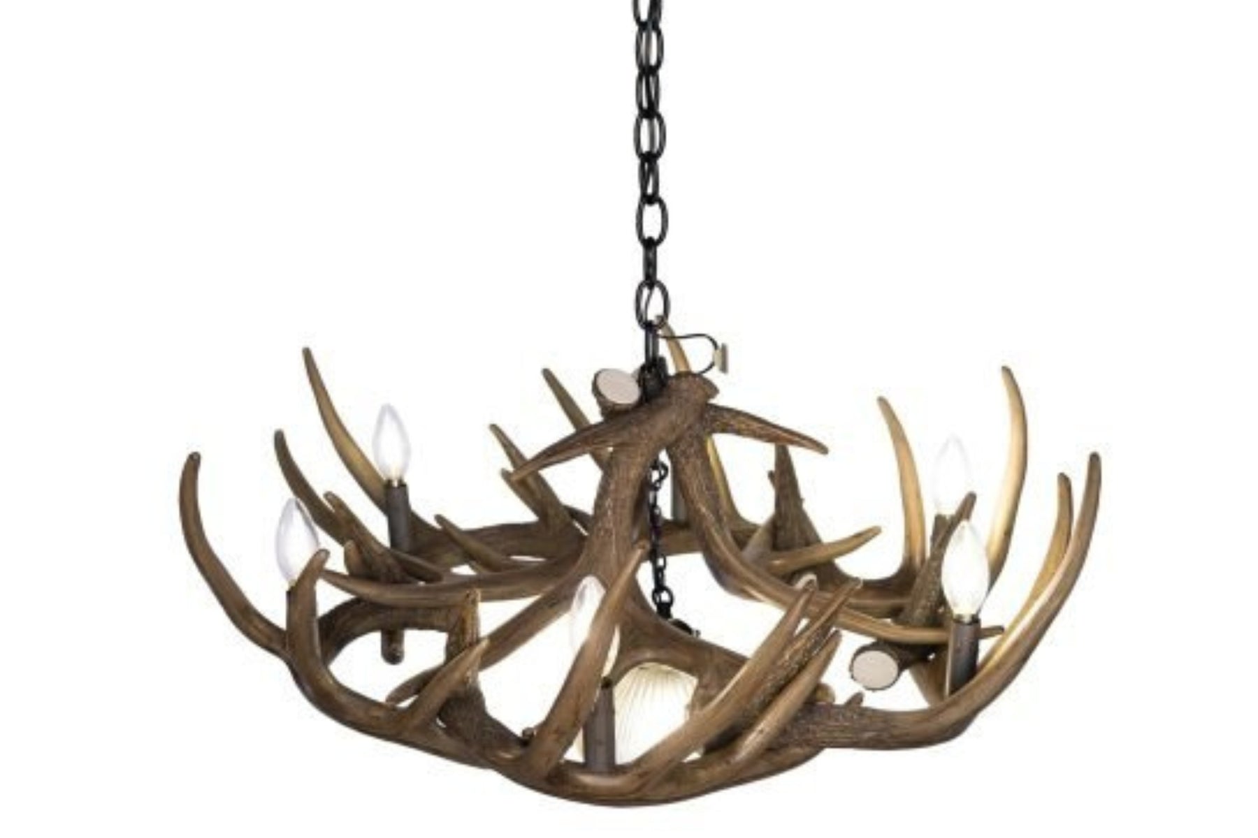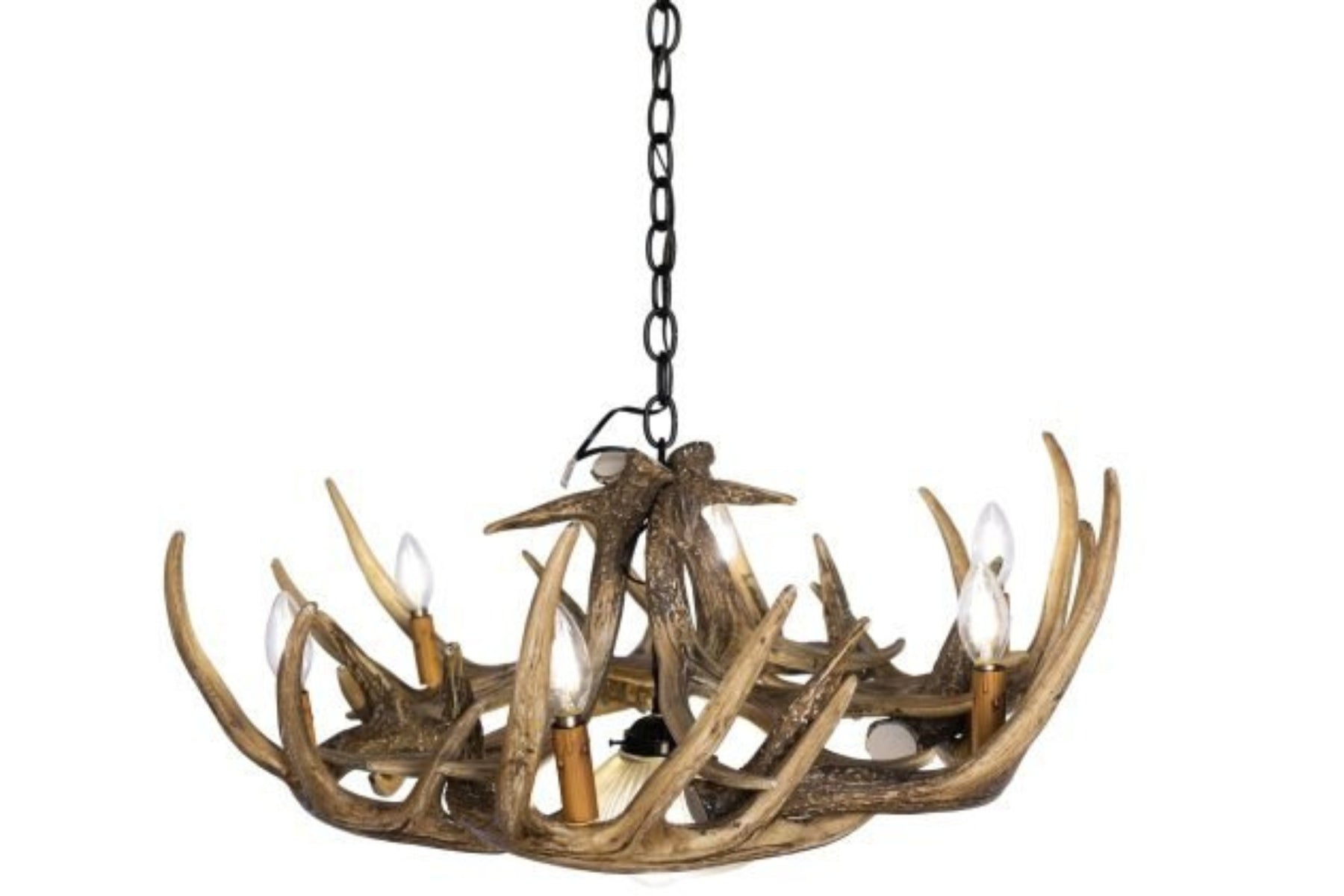 This whitetail deer 9 antler reproduction chandelier is compact, lightweight, and lets off the perfect amount of light. The 6 25-watt candelabra lights and one 60-watt down light, will light up any standard sized room, while providing that rustic, outdoor look. Each antler is made out of medium-density polyethylene material, and hand stained to provide that authentic look of real antlers. All antler lighting is handmade in the USA by a small family-owned company located in Utah. All authentic antler lighting sold on Inspired by the Outdoors is UL listed, safe, and all wiring is internal. Canopy, Mounting Hardware, and three feet of chain included.
