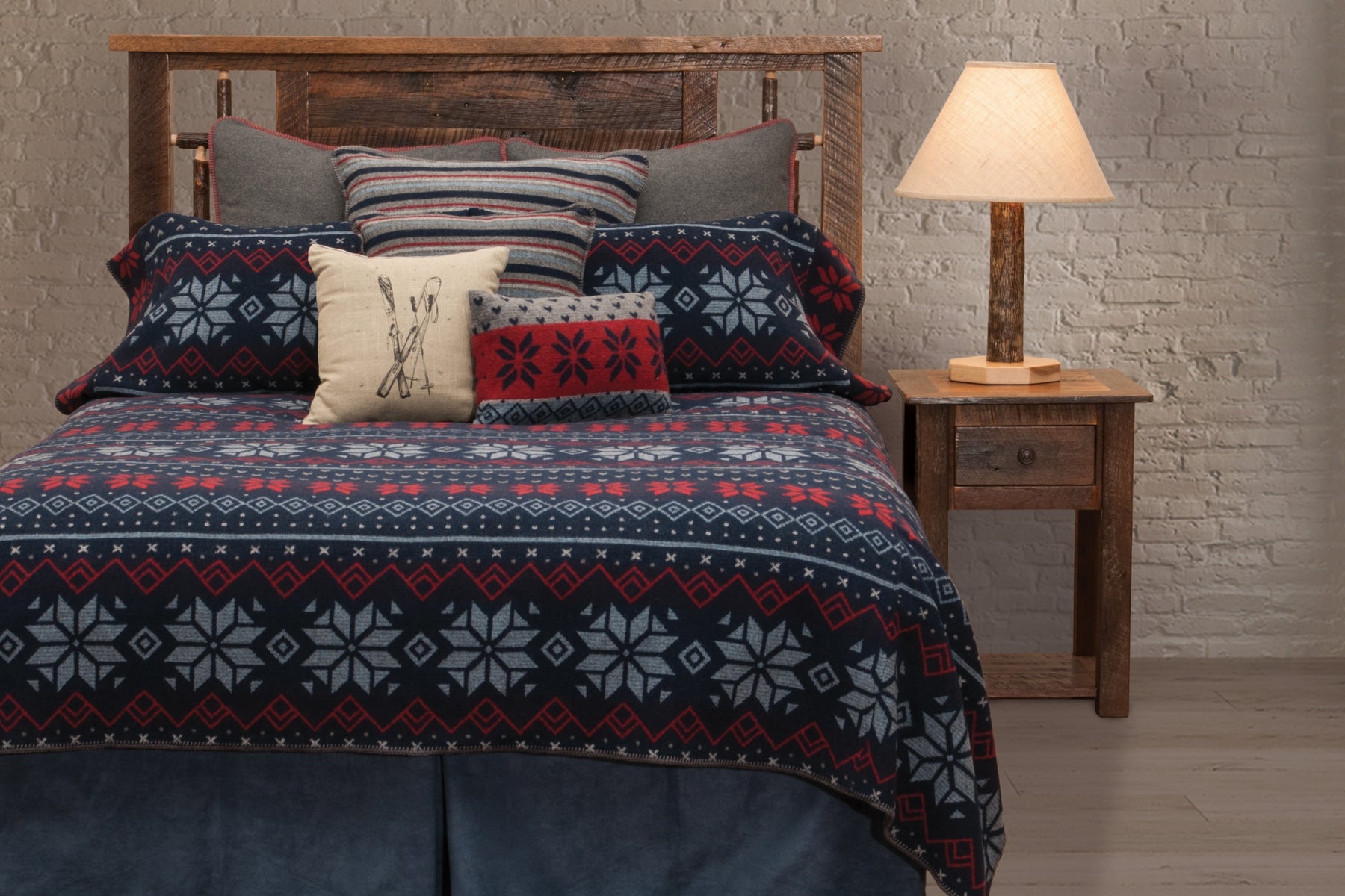 Give your bedroom a modern, cozy update with this Nordic bedspread set’s bold Scandinavian style! Showcasing a rich blue field with pops of red and soft blue snowflakes, this luxurious wool blend set will transform your space with its contemporary look. The alpine stripe pattern and cozy greystone add the perfect finishing touches. Plus, they’re all machine washable – making it easier than ever to care for this bedding set.