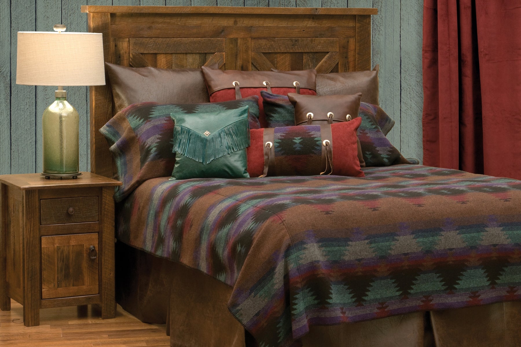 Create a cozy and inviting bedroom retreat with the Painted Desert III Bedding Set. This collection features tranquil teals, deep purples, rich tans, and vibrant reds that will transform your bedroom into a desert oasis. Crafted with a washable wool-blend fabric and accented with Conchos and faux leathers, you'll be sure to enjoy the softness and warmth of this bedspread set. Plus, it's made in the USA by expert craftspeople, so you know it's quality you can trust.