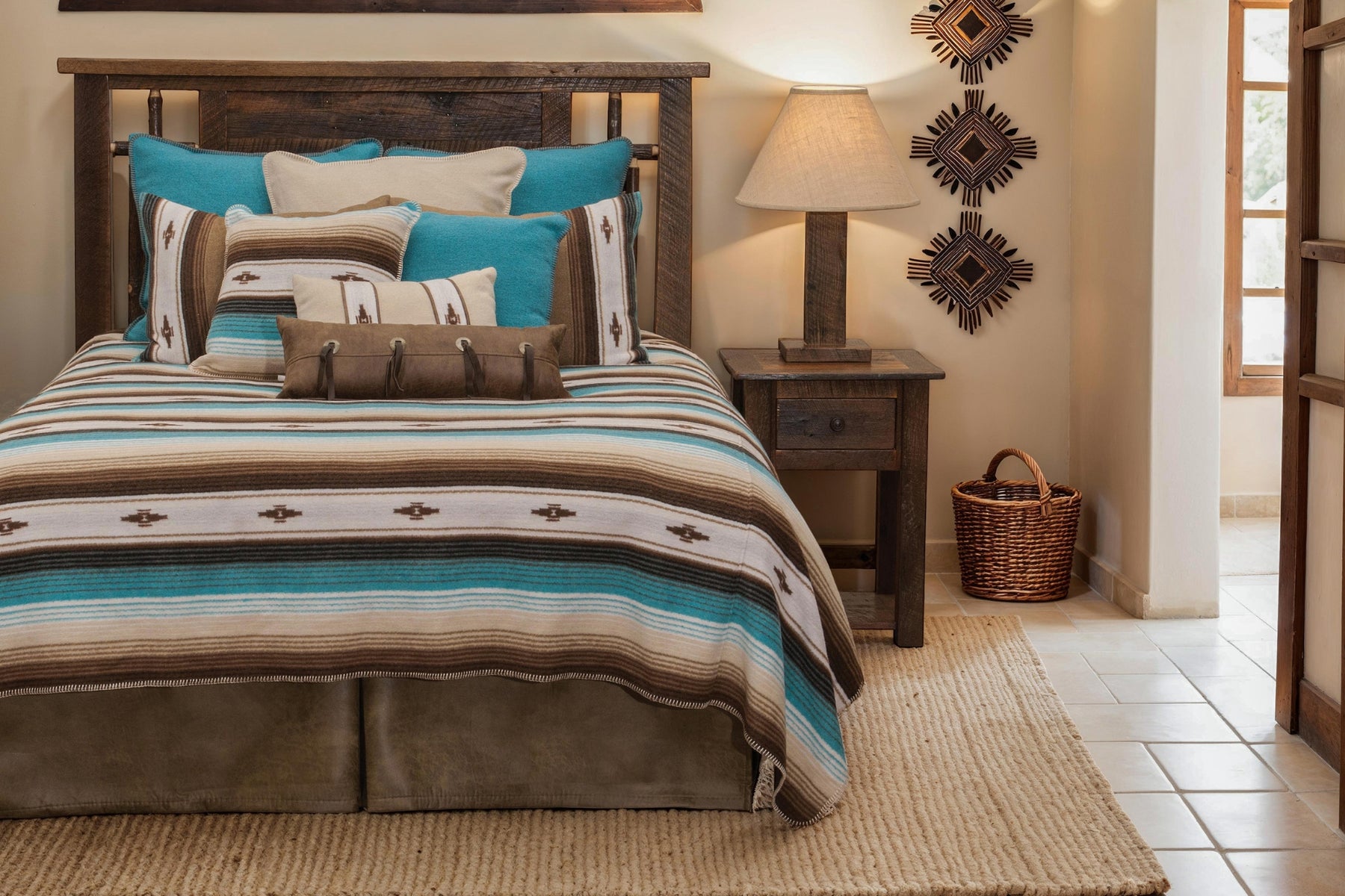 Transform your bedroom into a cozy, southwestern oasis with the Zarape Bedding Set! Crafted with a signature wool blend, this set features bright turquoise and chocolatey browns on a field of cream. Plus, all the pieces are machine washable and sewn in the USA by expert craftspeople. Make your bedroom come alive with this vibrant bedspread ensemble.