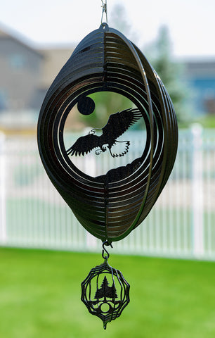 Bring this beautiful eye catching metal wind spinner which features a eagle design to your outdoor garden area. Each wind spinner is constructed of 18 gauge metal, and is painted with a baked on powder coat finish. This is a high gloss finish and will look different depending on the sunlight. Each spinner includes a stainless steel ball bearing swivel.