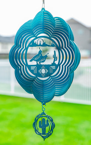 Add this beautiful eye catching metal wind spinner which features a quail design to your outdoor garden area. Each wind spinner is constructed of 18 gauge metal, and is painted with a baked on powder coat finish. This is a high gloss finish and will look different depending on the sunlight. Each spinner includes a stainless steel ball bearing swivel.
