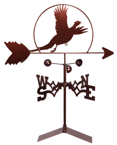 Add a decorative touch to the roof of your home, shed, or barn with this handmade working weathervane. This weathervane features a rooster pheasant design and is made of strong 16 gauge steel. The top pivots on a strong stainless steel pin. The wind-cups have a sealed ball bearing that will spin with the slightest breeze. Choose from 3 different mounts to fit your mounting needs.