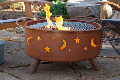 This Patina Products outdoor fire pit features a moon and star evening sky design. The natural rust finish on this fire pit ages beautifully over time, and the portable design allows it to be used at home, the beach, cabin, or campground.