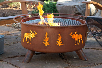 This Patina Products outdoor fire pit features a moose and pine tree design. The natural rust finish on this fire pit ages beautifully over time, and the portable design allows it to be used at home, the beach, cabin, or campground.