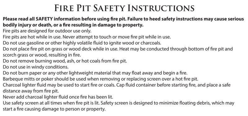 Each fire pit comes with a natural rust patina finish. The finish may have a yellow, brown, or even green appearance at first, and may also be flaky, dusty, or gritty to the touch. Once the fire pit is put into use (burned), the finish will turn to a darker, deep brown color. To avoid rust marks on the surface of your patio, or concrete pad, we recommend placing your fire pit on a non-flammable pad such as cement pavers, bricks, or large pieces and flat stone.