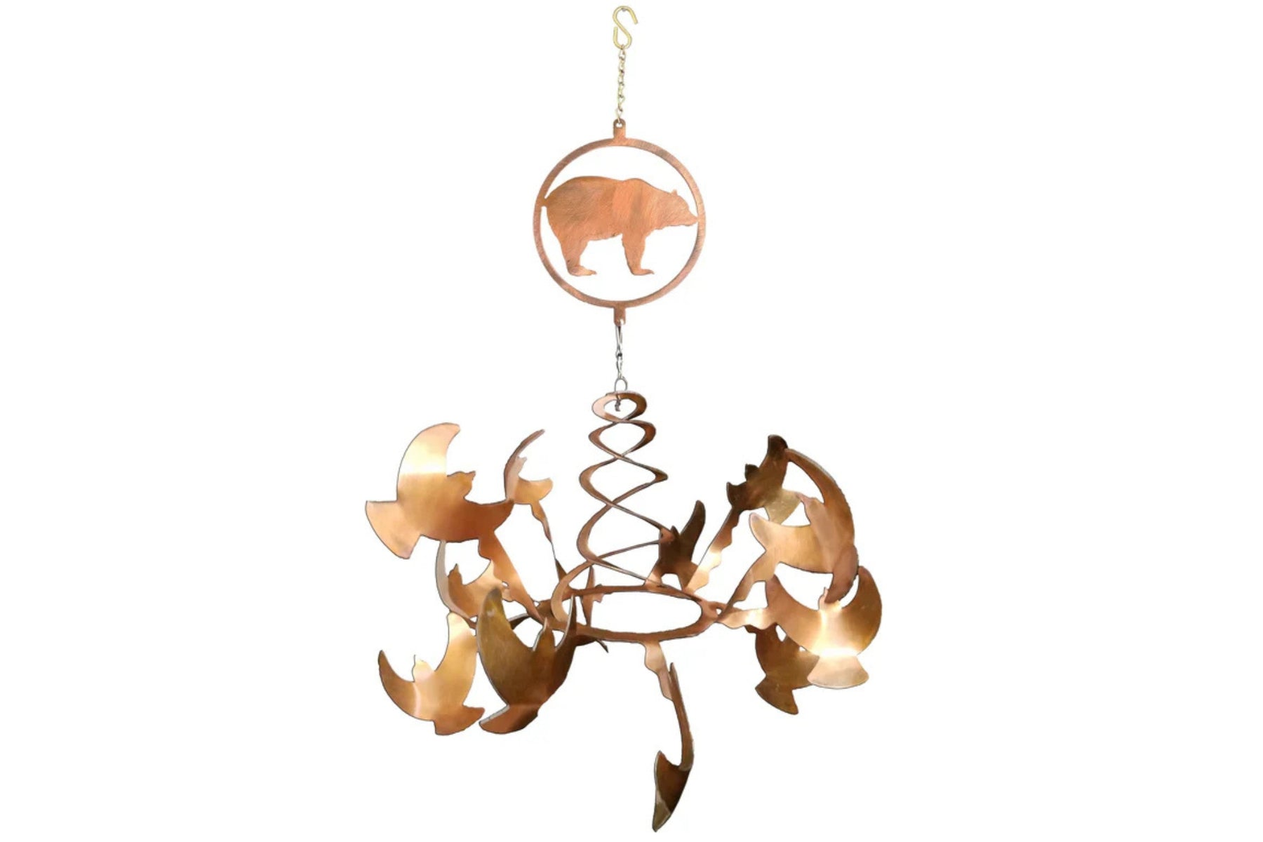 Transform your outdoor space with this bear design wind sculpture with bird spinners by Chris Crooks Designs. This wind sculpture is handcrafted from 18-gauge steel and features a durable sealed rusted finish. Each wind spinner features double spiral rising from a sturdy circular base holding 12-bird shaped arms that catch even the slightest breeze.