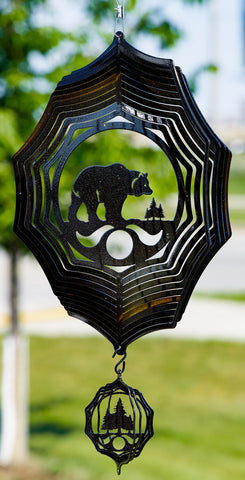 Bring this beautiful, eye-catching metal wind spinner which features a bear design to your outdoor garden area. Each wind spinner is constructed of 18 gauge metal, and is painted with a baked on powder coat finish. This is a high gloss finish that will look different depending on the sunlight. Each spinner includes a stainless-steel ball bearing swivel.