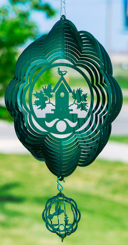 Bring this beautiful, eye-catching metal wind spinner which features a birdhouse design to your outdoor garden area. Each wind spinner is constructed of 18 gauge metal, and is painted with a baked on powder coat finish. This is a high gloss finish which will look different depending on the sunlight. Each spinner includes a stainless-steel ball bearing swivel.