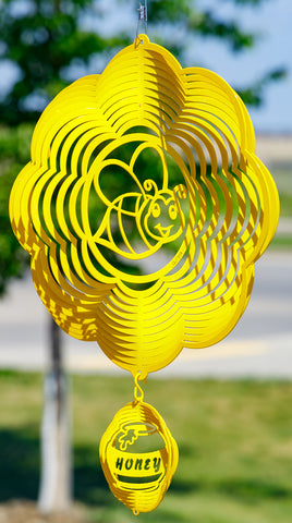 Bring this beautiful, eye-catching metal wind spinner which features a bumblebee design to your outdoor garden area. Each wind spinner is constructed of 18 gauge metal, and is painted with a baked on powder coat finish. This is a high gloss finish which will look different depending on the sunlight. Each spinner includes a stainless-steel ball bearing swivel.