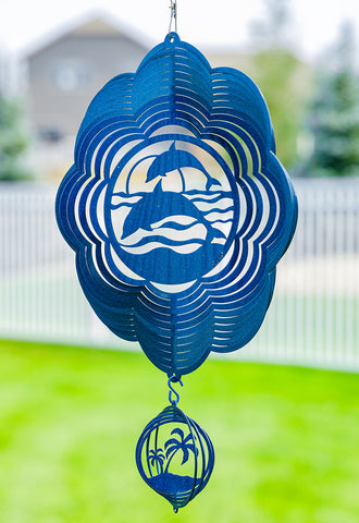 Bring this beautiful, eye-catching metal wind spinner which features a dolphin design to your outdoor garden area. Each wind spinner is constructed of 18 gauge metal, and is painted with a baked on powder coat finish. This is a high gloss finish which will look different depending on the sunlight. Each spinner includes a stainless-steel ball bearing swivel.
