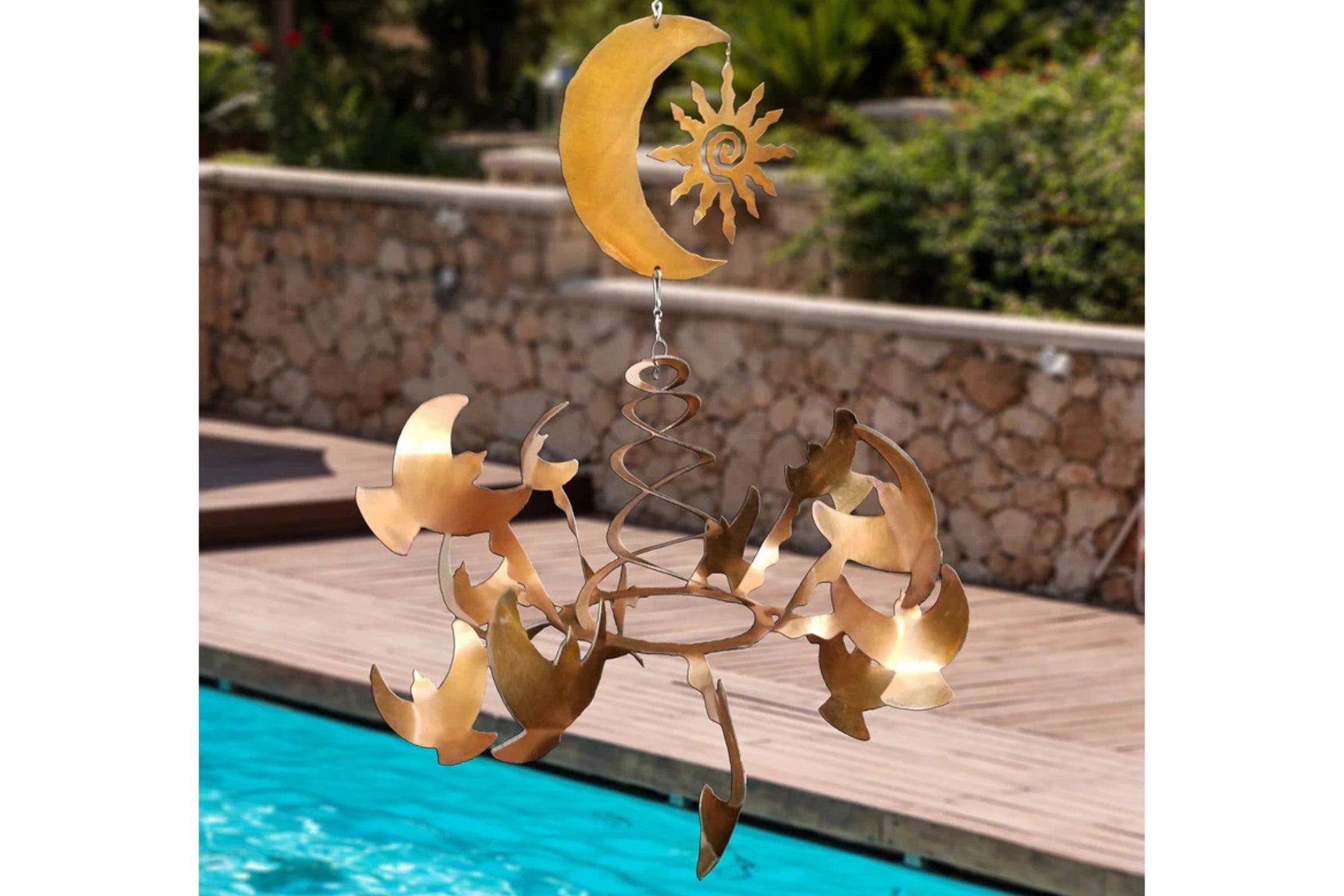 Transform your outdoor space with this southwest eclipse moon and sun design wind sculpture with bird wind spinners by Chris Crooks Designs. This wind sculpture is handcrafted from 18-gauge steel and features a durable sealed rusted finish. Each wind spinner features double spiral rising from a sturdy circular base holding 12-bird shaped arms that catch even the slightest breeze.
