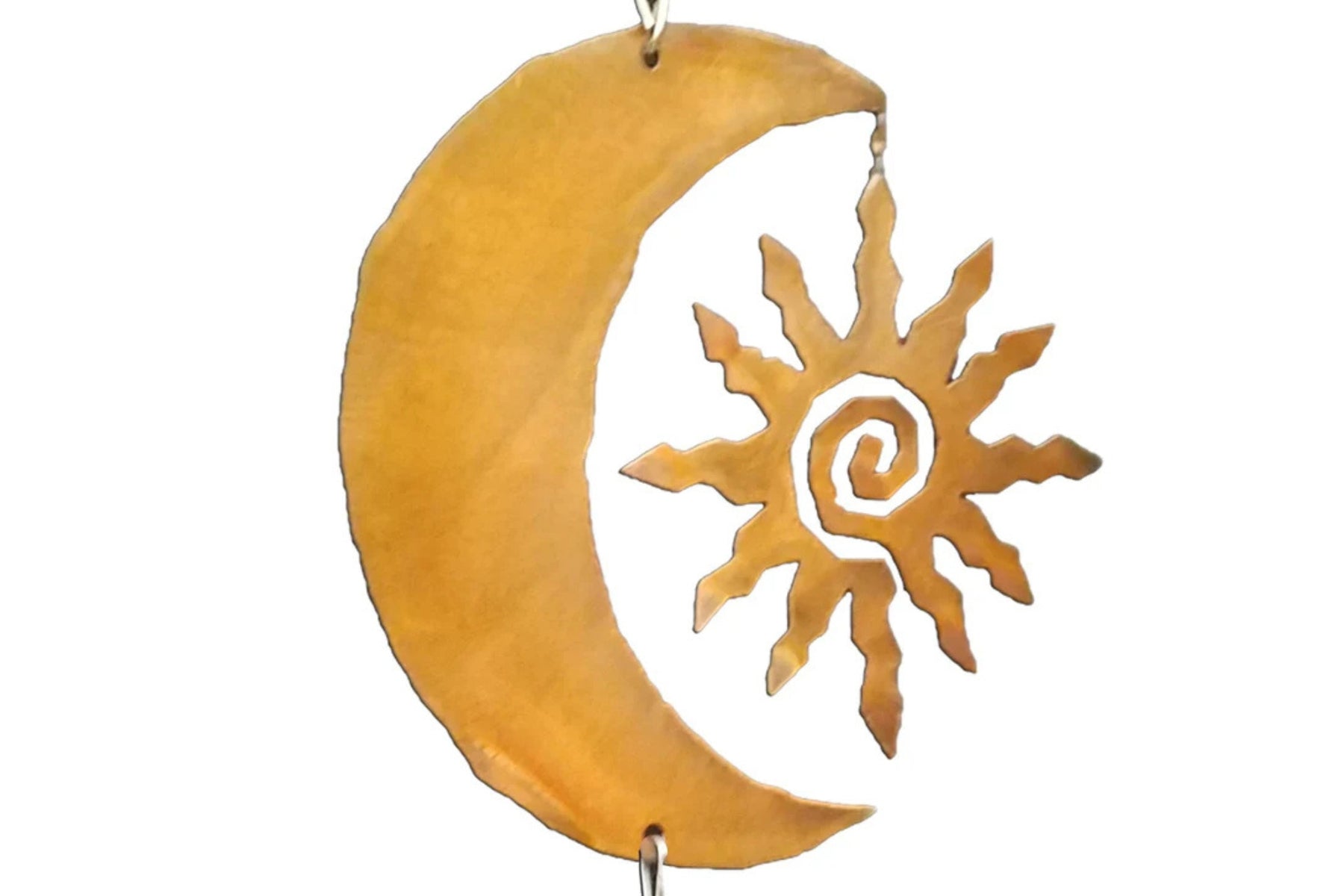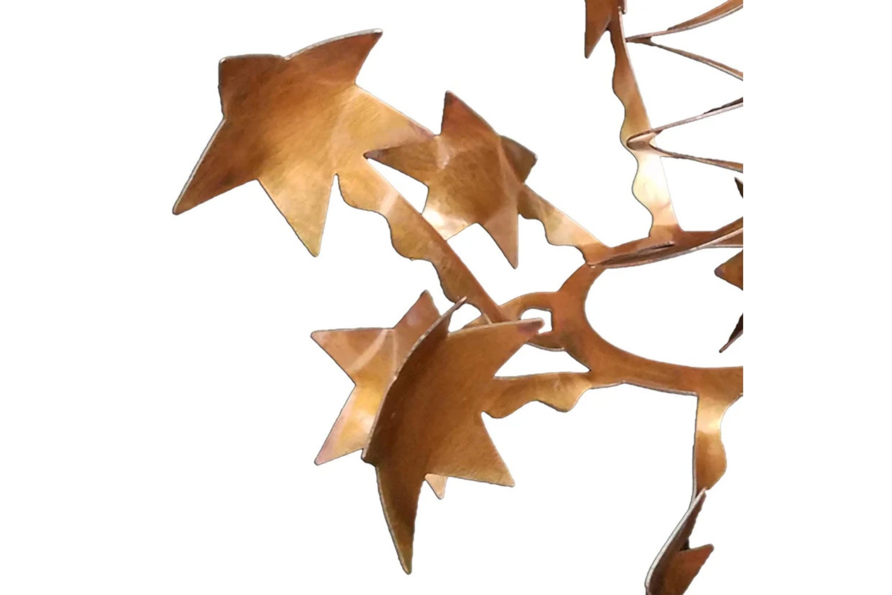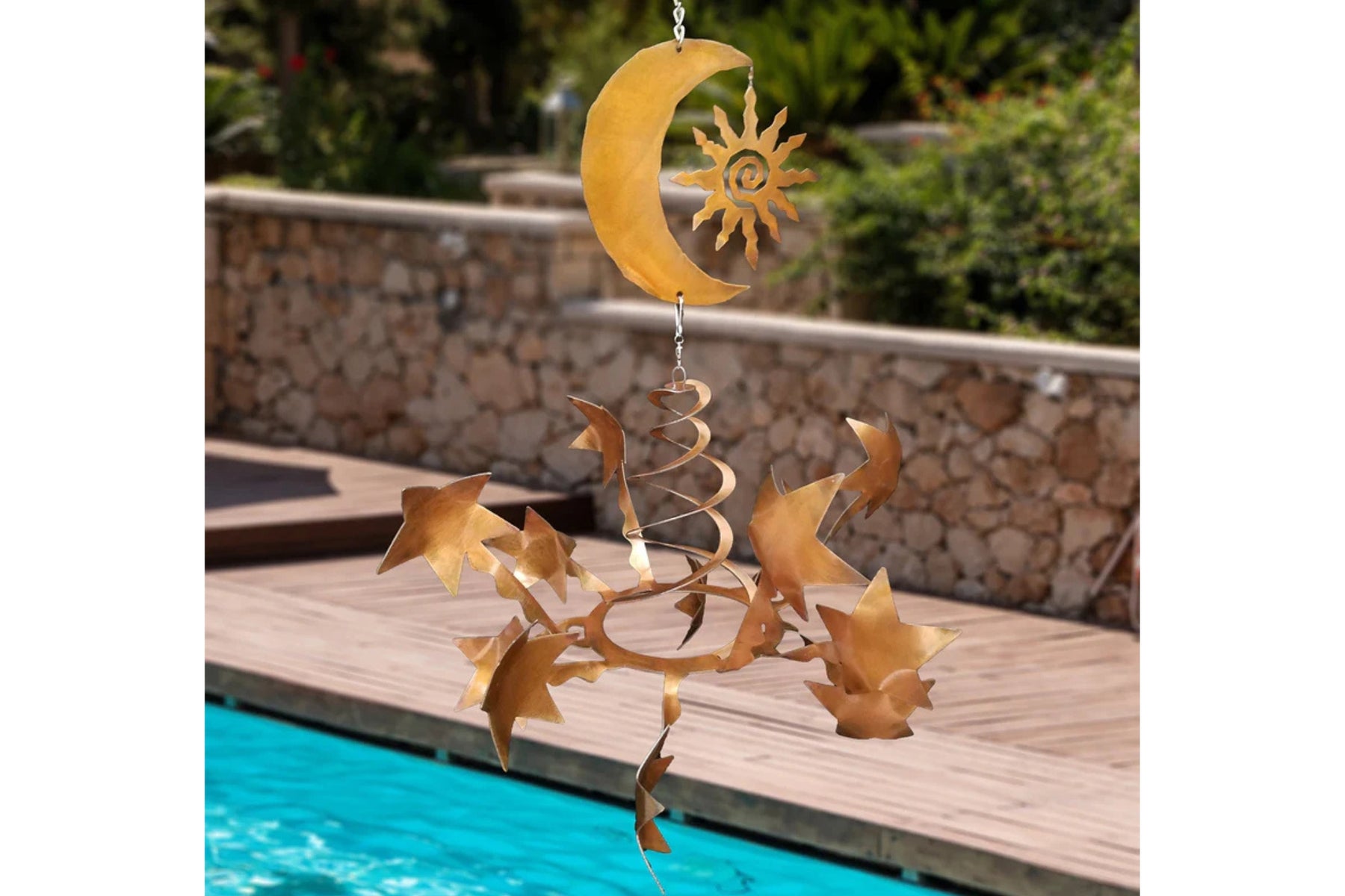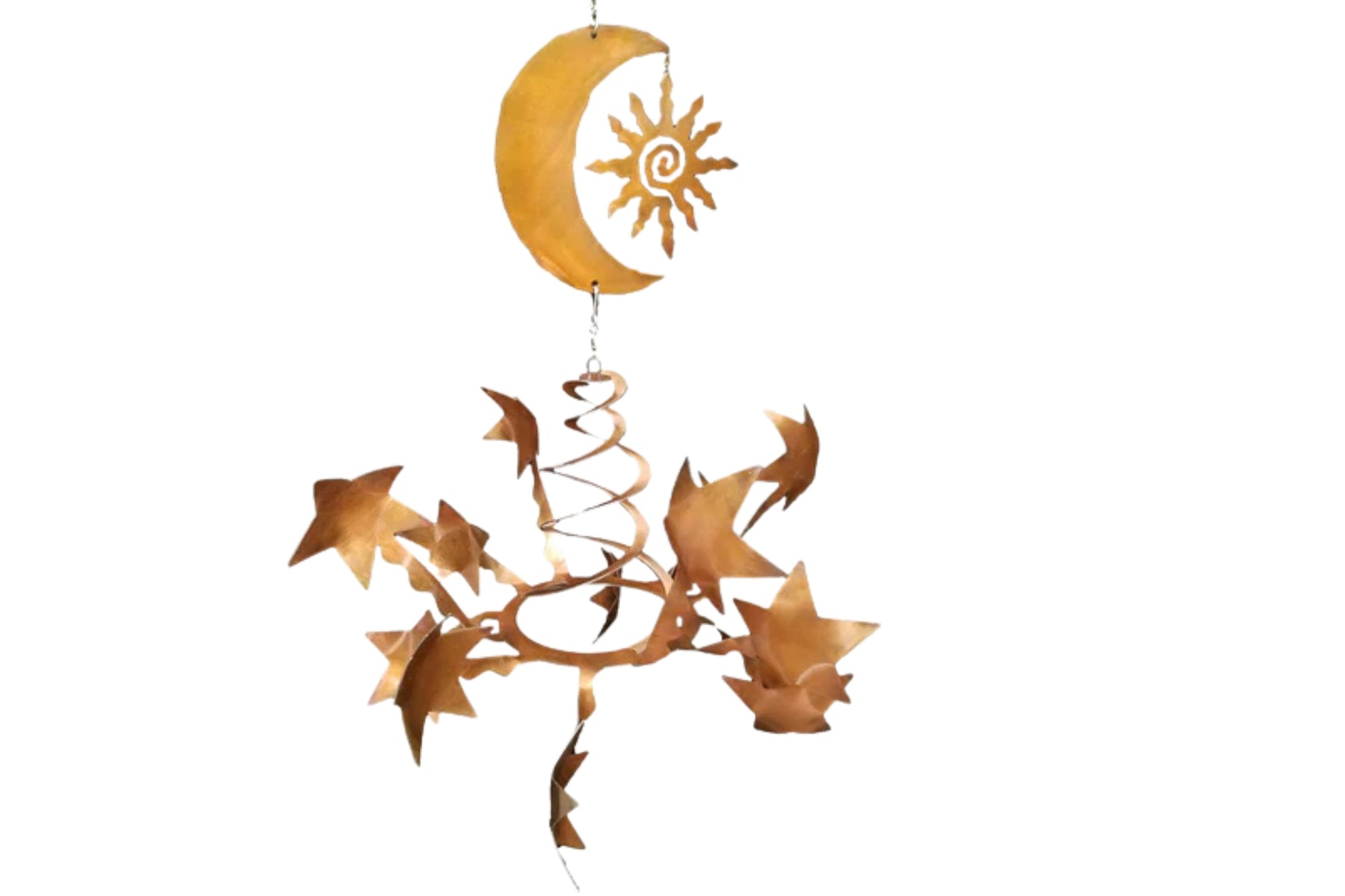 Transform your outdoor space with this southwest eclipse moon and sun design wind sculpture with star wind spinners by Chris Crooks Designs. This wind sculpture is handcrafted from 18-gauge steel and features a durable sealed rusted finish. Each wind spinner features double spiral rising from a sturdy circular base holding 12-star shaped arms that catch even the slightest breeze.