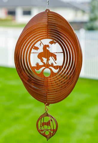 Bring this beautiful eye catching metal wind spinner which features an end of trail design to your outdoor garden area. Each wind spinner is constructed of 18 gauge metal, and is painted with a baked on powder coat finish. This is a high gloss finish and will look different depending on the sunlight. Each spinner includes a stainless steel ball bearing swivel.