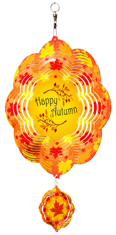 Add this beautiful eye catching metal wind spinner which features a fall design to your outdoor garden area. Each wind spinner is constructed of 18 gauge metal, and is painted with a baked on powder coat finish. This is a high gloss finish and will look different depending on the sunlight. Each spinner includes a stainless steel ball bearing swivel.