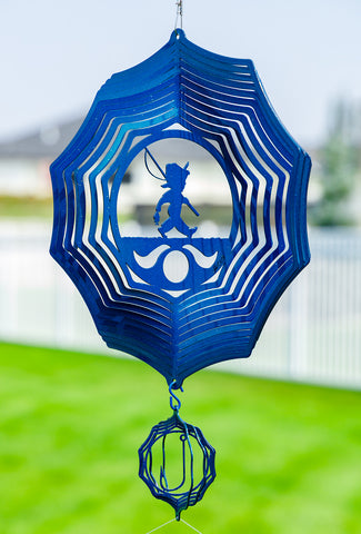Bring this beautiful eye catching metal wind spinner which features a fisher boy to your outdoor garden area. Each wind spinner is constructed of 18 gauge metal, and is painted with a baked on powder coat finish. This is a high gloss finish and will look different depending on the sunlight. Each spinner includes a stainless steel ball bearing swivel.