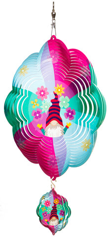 Add this beautiful eye catching metal wind spinner, which features a multi colored garden gnome to your outdoor garden area. Each wind spinner is constructed of 18 gauge metal, and is painted with a baked on powder coat finish. This is a high gloss finish and will look different depending on the sunlight. Each spinner includes a stainless steel ball bearing swivel.