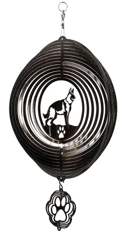 Add this beautiful eye catching metal wind spinner which features a German Shepherd dog design to your outdoor garden area. Each wind spinner is constructed of 18 gauge metal, and is painted with a baked on powder coat finish. This is a high gloss finish and will look different depending on the sunlight. Each spinner includes a stainless steel ball bearing swivel.