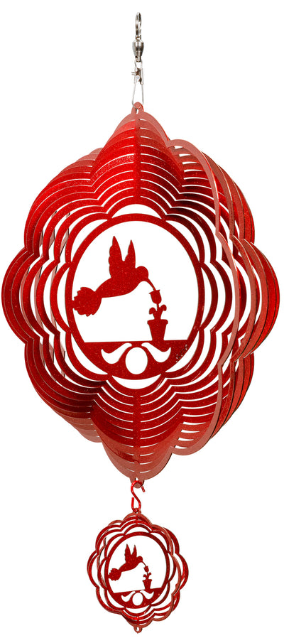 Bring this beautiful, eye-catching metal wind spinner which features a hummingbird design to your outdoor garden area. Each wind spinner is constructed of 18 gauge metal, and is painted with a baked on powder coat finish. This is a high gloss finish which will look different depending on the sunlight. Each spinner includes a stainless-steel ball bearing swivel.