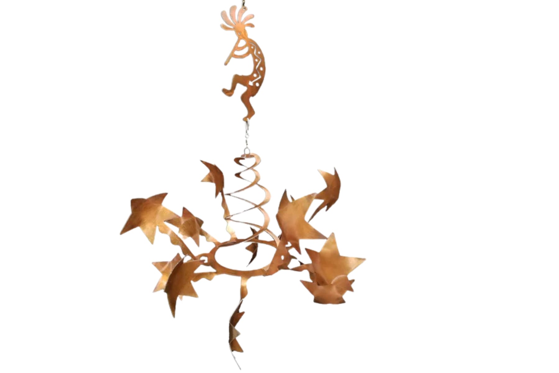 Transform your outdoor space with this southwest kokopelli design wind sculpture with star wind spinners by Chris Crooks Designs. This wind sculpture is handcrafted from 18-gauge steel and features a durable sealed rusted finish. Each wind spinner features double spiral rising from a sturdy circular base holding 12-star shaped arms that catch even the slightest breeze.