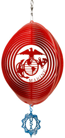 Show your support of the United States Marine Corps, by adding this beautiful eye-catching metal wind spinner, which features the Marine Corps Seal, to your outdoor garden area. Each wind spinner is constructed of 18 gauge metal, and is painted with a baked on powder coat finish. This is a high gloss finish which will look different depending on the sunlight. Each spinner includes a stainless-steel ball bearing swivel.