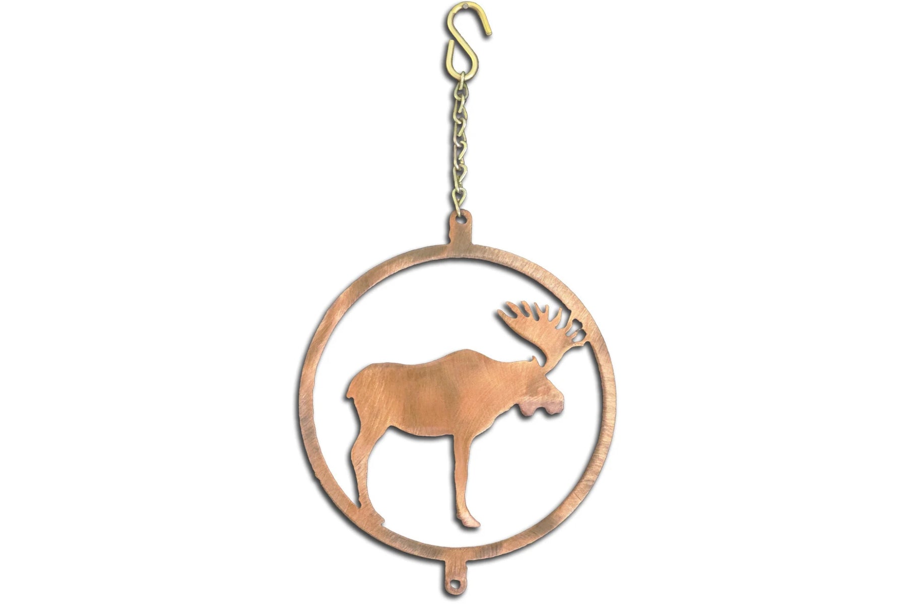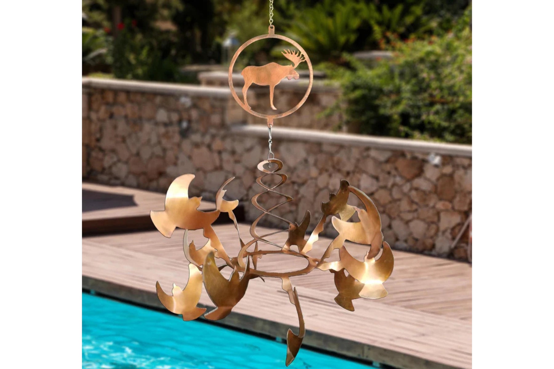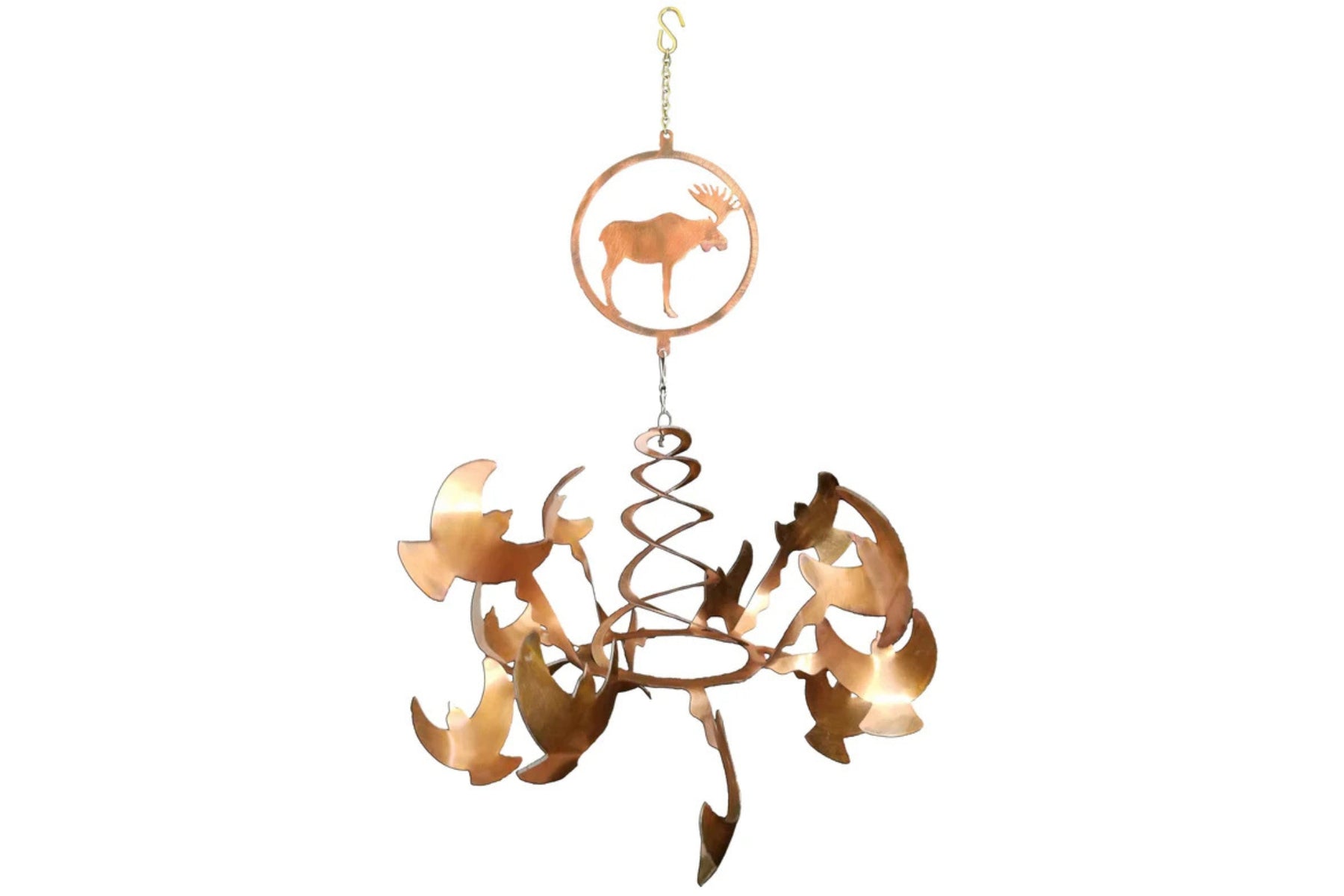 Transform your outdoor space with this moose design wind sculpture with bird wind spinners by Chris Crooks Designs. This wind sculpture is handcrafted from 18-gauge steel and features a durable sealed rusted finish. Each wind spinner features double spiral rising from a sturdy circular base holding 12-bird shaped arms that catch even the slightest breeze.