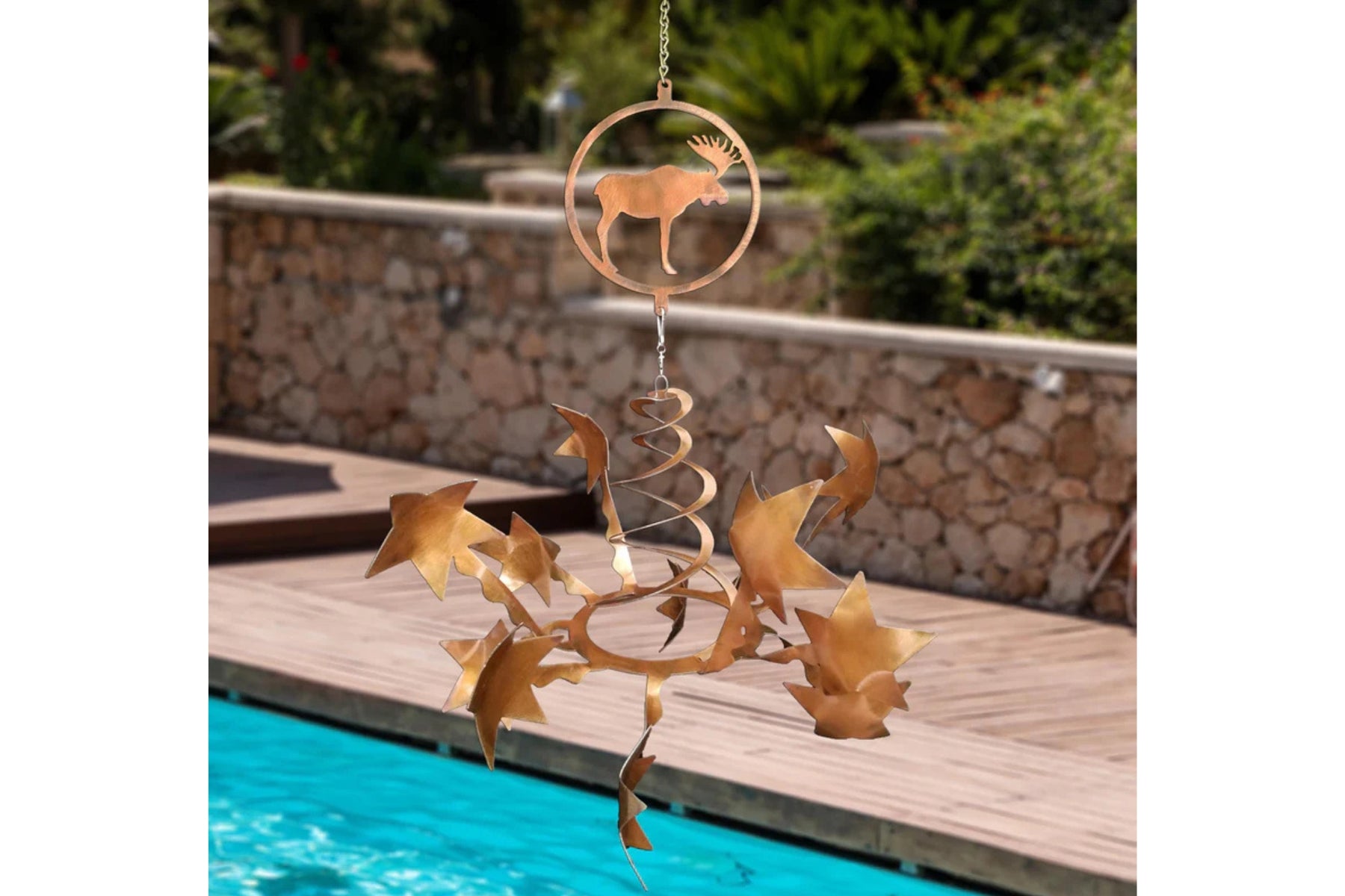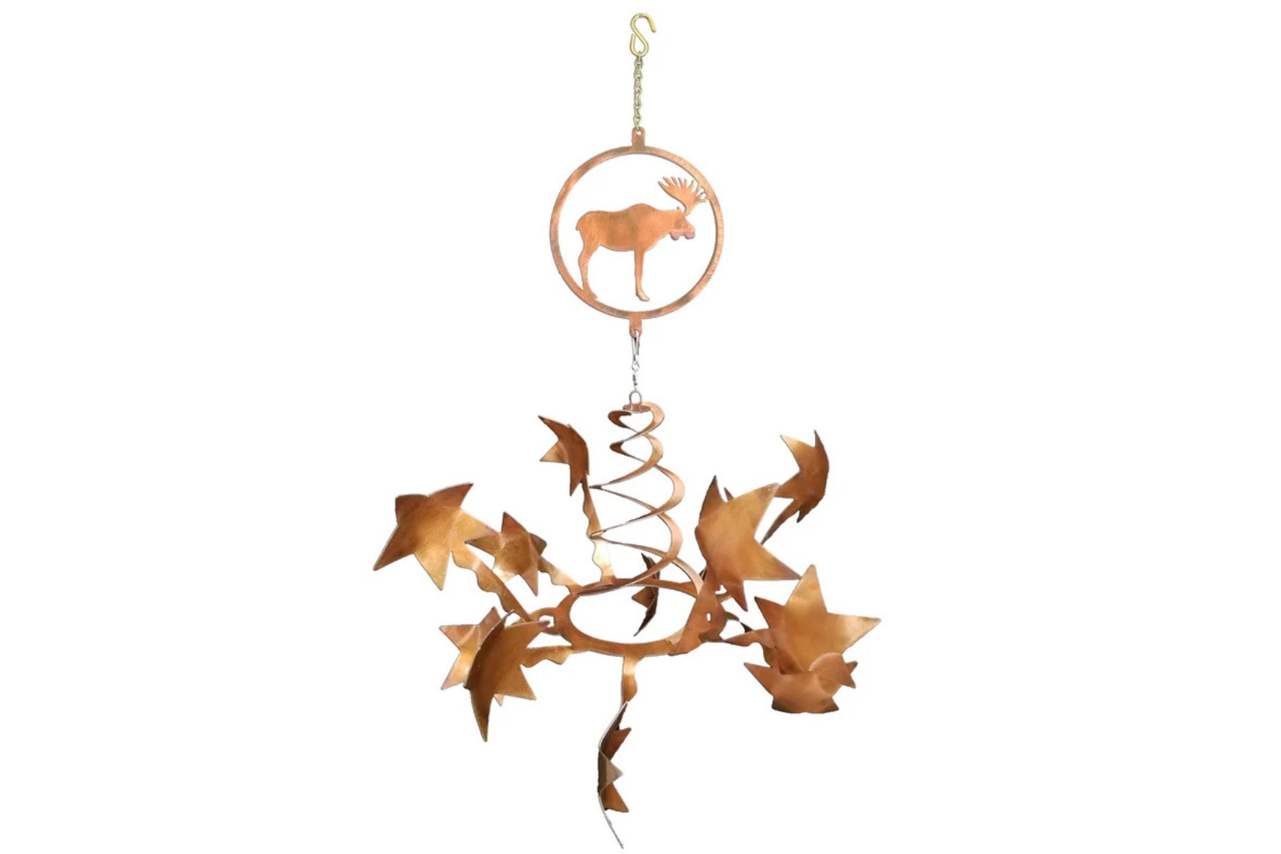 Transform your outdoor space with this moose design wind sculpture with star wind spinners by Chris Crooks Designs. This wind sculpture is handcrafted from 18-gauge steel and features a durable sealed rusted finish. Each wind spinner features double spiral rising from a sturdy circular base holding 12-star shaped arms that catch even the slightest breeze.