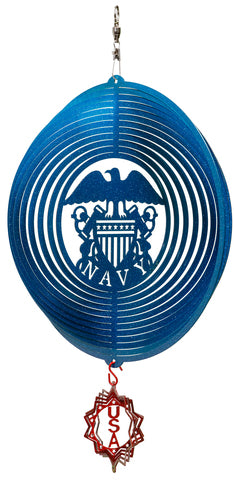 Show your support of the United States Navy, by adding this beautiful eye catching metal wind spinner, which features the Navy Seal to your outdoor garden area. Each wind spinner is constructed of 18 gauge metal, and is painted with a baked on powder coat finish. This is a high gloss finish and will look different depending on the sunlight. Each spinner includes a stainless steel ball bearing swivel.