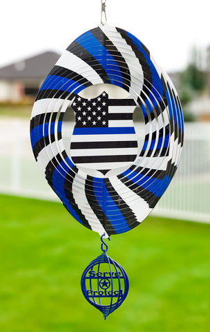 Support your local Law Enforcement by adding this beautiful eye-catching metal wind spinner which features a Police Blue Line design to your outdoor garden area. Each wind spinner is constructed of 18 gauge metal, and is painted with a baked on powder coat finish. This is a high gloss finish which will look different depending on the sunlight. Each spinner includes a stainless-steel ball bearing swivel.