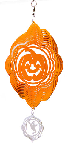 Add this beautiful eye catching metal wind spinner which features a pumpkin design to your outdoor garden area. Each wind spinner is constructed of 18 gauge metal, and is painted with a baked on powder coat finish. This is a high gloss finish and will look different depending on the sunlight. Each spinner includes a stainless steel ball bearing swivel.