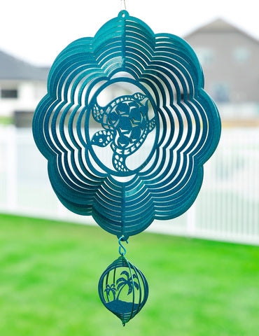 Add this beautiful eye-catching metal wind spinner which features a sea turtle design to your outdoor garden area. Each wind spinner is constructed of 18 gauge metal, and is painted with a baked on powder coat finish. This is a high gloss finish which will look different depending on the sunlight. Each spinner includes a stainless-steel ball bearing swivel.