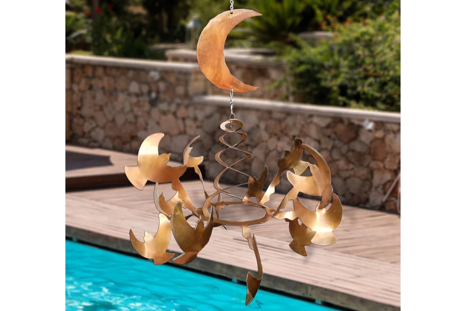 Transform your outdoor space with this southwest moon design wind sculpture with bird wind spinners by Chris Crooks Designs. This wind sculpture is handcrafted from 18-gauge steel and features a durable sealed rusted finish. Each wind spinner features double spiral rising from a sturdy circular base holding 12-bird shaped arms that catch even the slightest breeze.