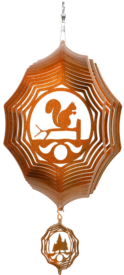Add this beautiful eye catching metal wind spinner which features a squirrel design to your outdoor garden area. Each wind spinner is constructed of 18 gauge metal, and is painted with a baked on powder coat finish. This is a high gloss finish and will look different depending on the sunlight. Each spinner includes a stainless steel ball bearing swivel.
