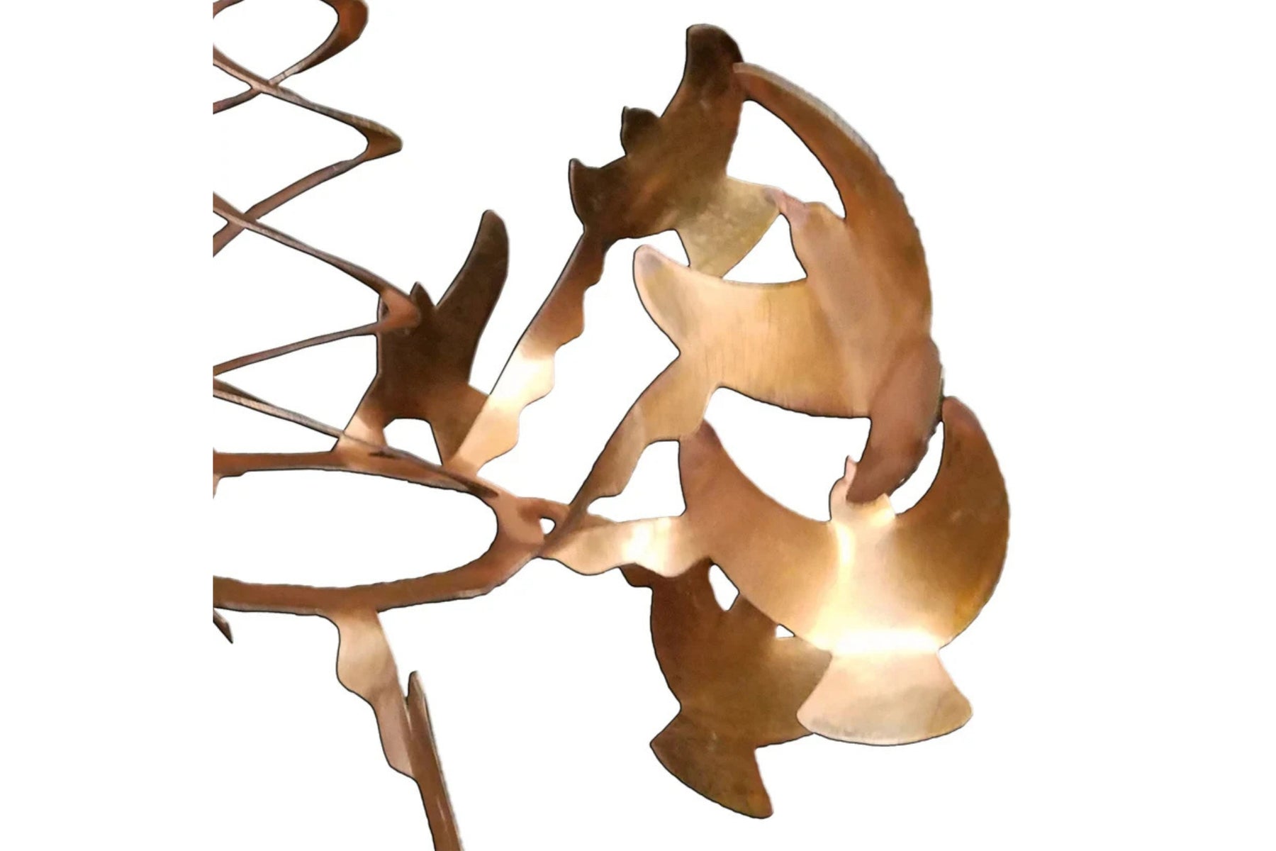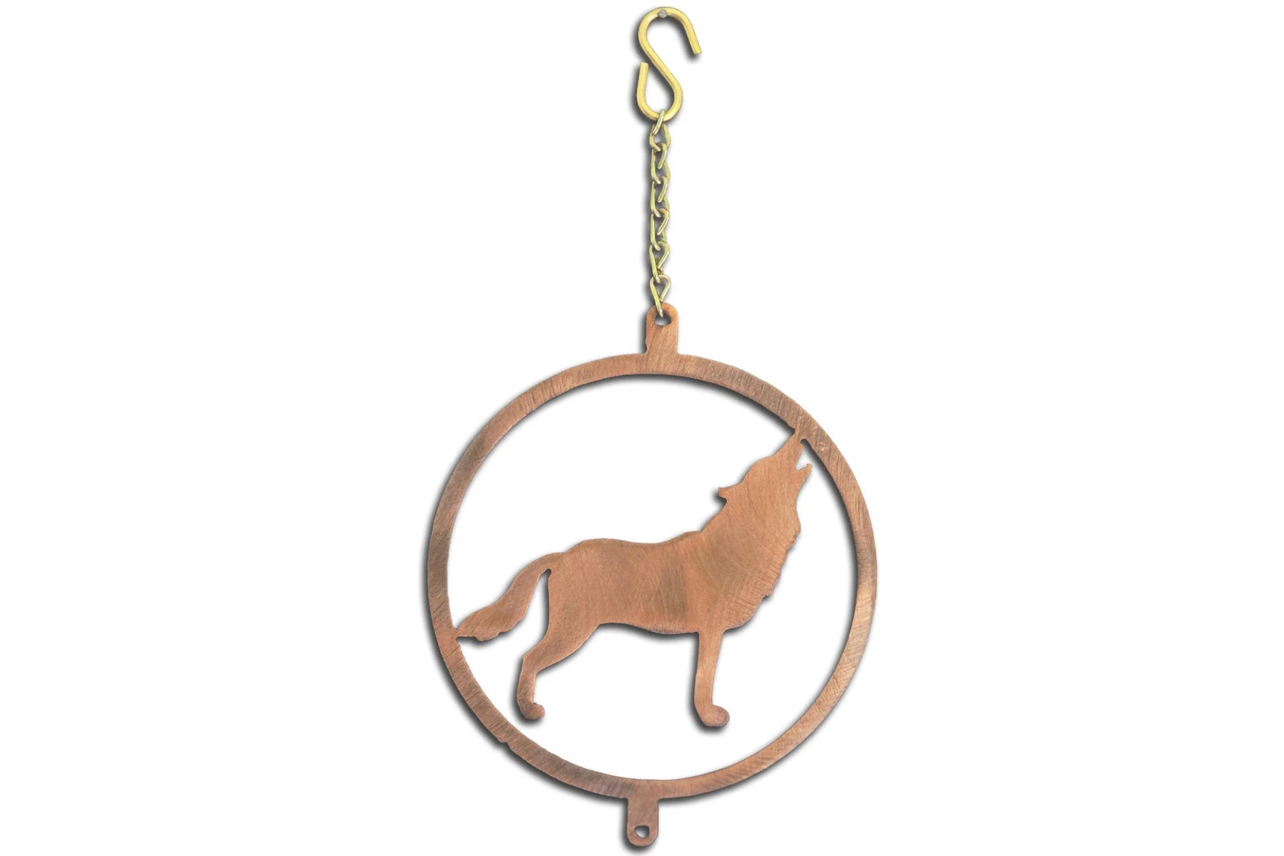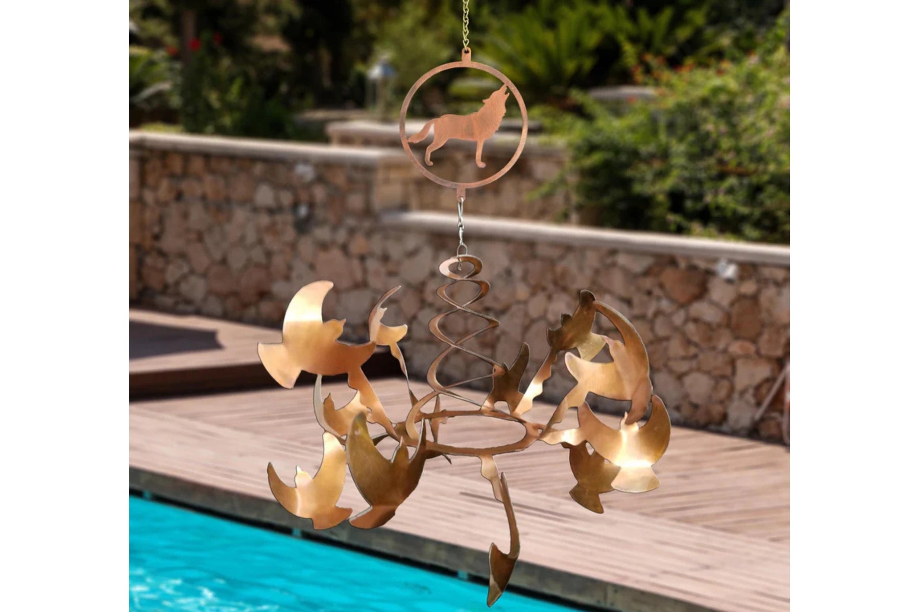 Transform your outdoor space with this wolf design wind sculpture with bird wind spinners by Chris Crooks Designs. This wind sculpture is handcrafted from 18-gauge steel and features a durable sealed rusted finish. Each wind spinner features double spiral rising from a sturdy circular base holding 12-bird shaped arms that catch even the slightest breeze.
