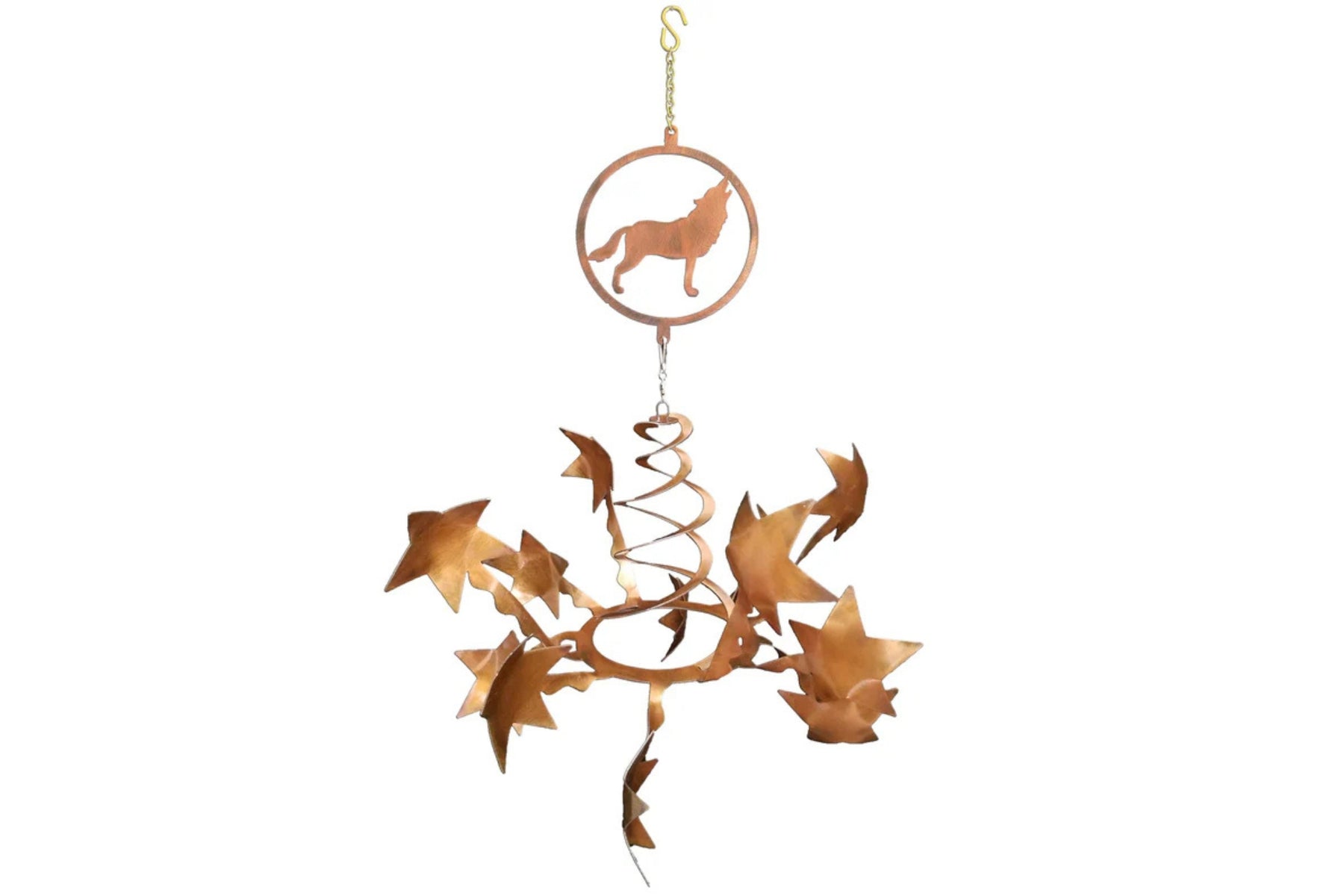 Transform your outdoor space with this wolf design wind sculpture with star wind spinners by Chris Crooks Designs. This wind sculpture is handcrafted from 18-gauge steel and features a durable sealed rusted finish. Each wind spinner features double spiral rising from a sturdy circular base holding 12-star shaped arms that catch even the slightest breeze.