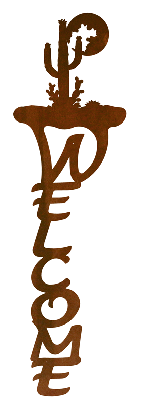 Greet a visitor into your home, cabin, or lodge with this desert cactus vertical metal welcome sign. This sign is perfect to hang in those places with limited space due to its vertical presentation. The powder coat metal finish on each piece will insure many years of use in an outdoor setting.
