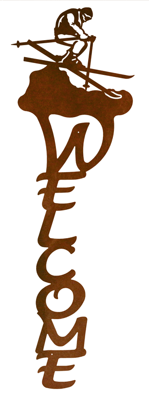 Greet a visitor into your home, cabin, or lodge with this skier vertical metal welcome sign. This sign is perfect to hang in those places with limited space due to its vertical presentation. The powder coat metal finish on each piece will insure many years of use in an outdoor setting.