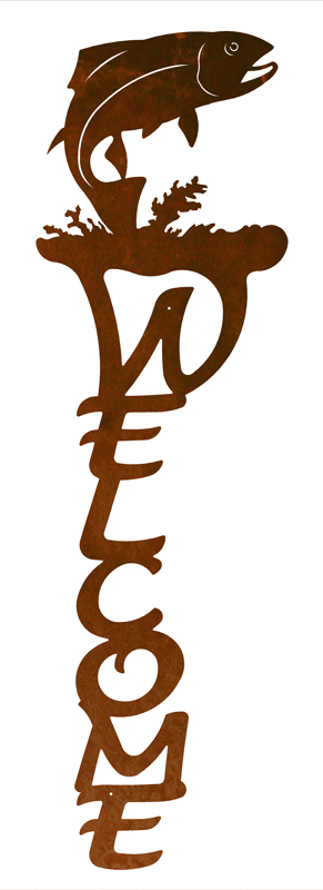Greet a visitor into your home, cabin, or lodge with this trout vertical metal welcome sign. This sign is perfect to hang in those places with limited space due to its vertical presentation. The powder coat metal finish on each piece will insure many years of use in an outdoor setting.