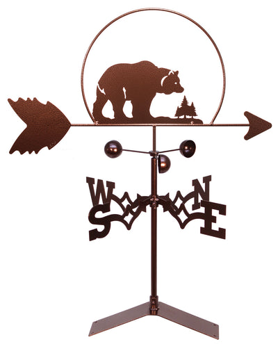Add a decorative touch to the roof of your home, shed, or barn with this handmade working weathervane. This weathervane features a bear design and is made of strong 16 gauge steel. The top pivots on a strong stainless steel pin. The wind-cups have a sealed ball bearing that will spin with the slightest breeze. Choose from 3 different mounts to fit your mounting needs.