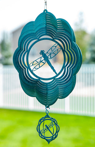 Bring this beautiful eye catching metal wind spinner which features a dragon fly design to your outdoor garden area. Each wind spinner is constructed of 18 gauge metal, and is painted with a baked on powder coat finish. This is a high gloss finish and will look different depending on the sunlight. Each spinner includes a stainless steel ball bearing swivel.